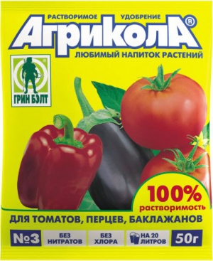 Агрикола-3 - универсальное, высокоэффективное, бесхлороное, водорастворимое, комплексное удобрение, содержащее сбалансированное количество макро- и микроэлементов и предназначенное для корневых и внекорневых подкормок томатов, перцев, баклажан. Элементы питания в нем находятся в легкоусвояемой форме. Содержащиеся в удобрении микроэлементы увеличивают содержание витамина С и каротина, повышают устойчивость к грибковым, бактериальным и вирусным заболеваниям, к неблагоприятным климатическим условиям.